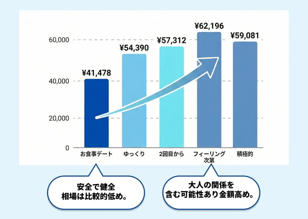 Aタイプ(食事のみ)は安全性が高く相場は低めですが、C〜Dタイプのように大人の関係を含む場合は金額が上がりやすい傾向があります。