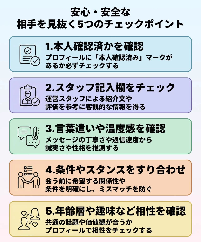 本人確認が行われていないアプリでは、未成年者や業者が紛れ込みやすく、トラブルにつながるリスクが高まります。