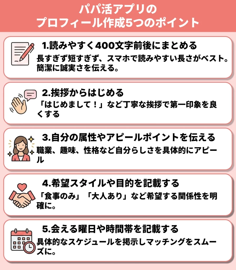 ここでは、パパ活アプリで注目されやすいプロフィール作成のポイント5つ紹介します。
