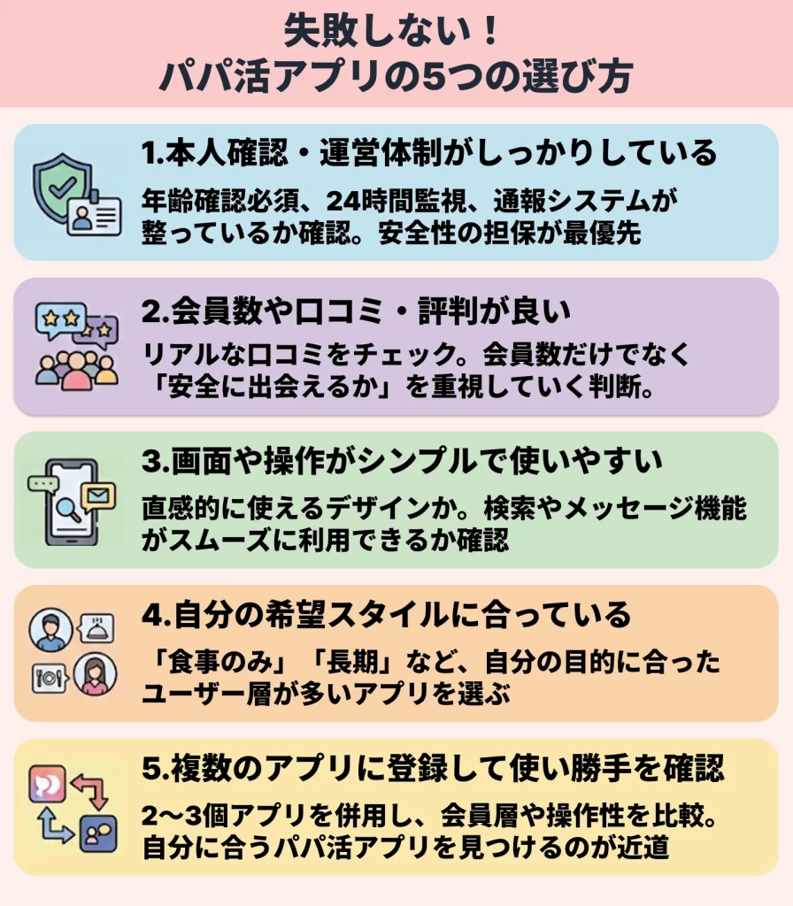 初心者がパパ活アプリやパパ活サイトを選ぶ際には、次の5つのポイントを確認してください。