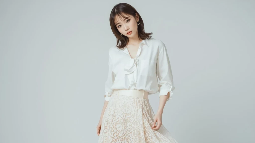 ブラウスはレースやリボン付きのデザインを選ぶと、女性らしさを演出できます。